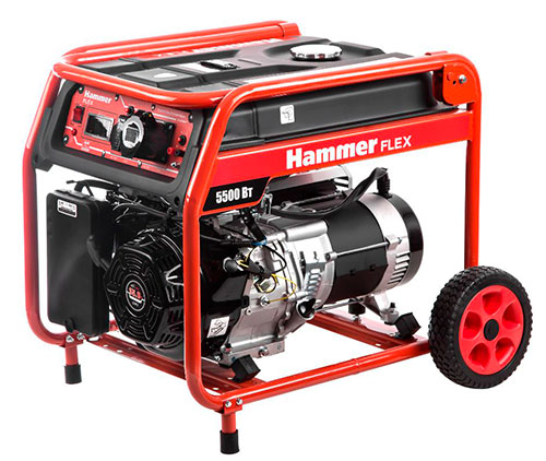 Бензиновый генератор Hammer Flex GN6000T обеспечивает качественное питание электроинструментов, бытовой техники и прочих потребителей суммарной мощностью до 5,5 кВт. Для удобства транспортировки в комплекте имеются колеса и ручка.