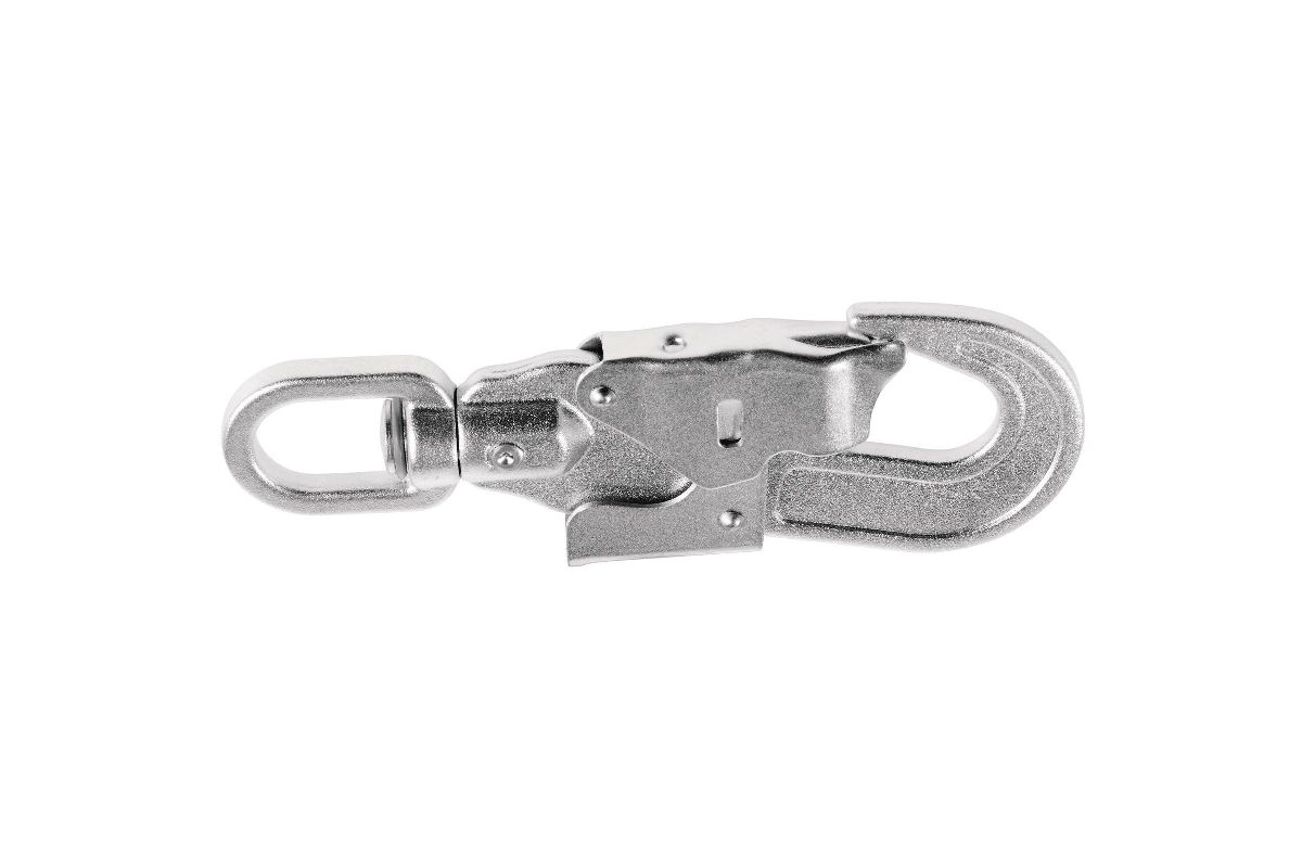 - Модель оснащена карабином-крюком с вертлюгом из стали и индикатором падения;